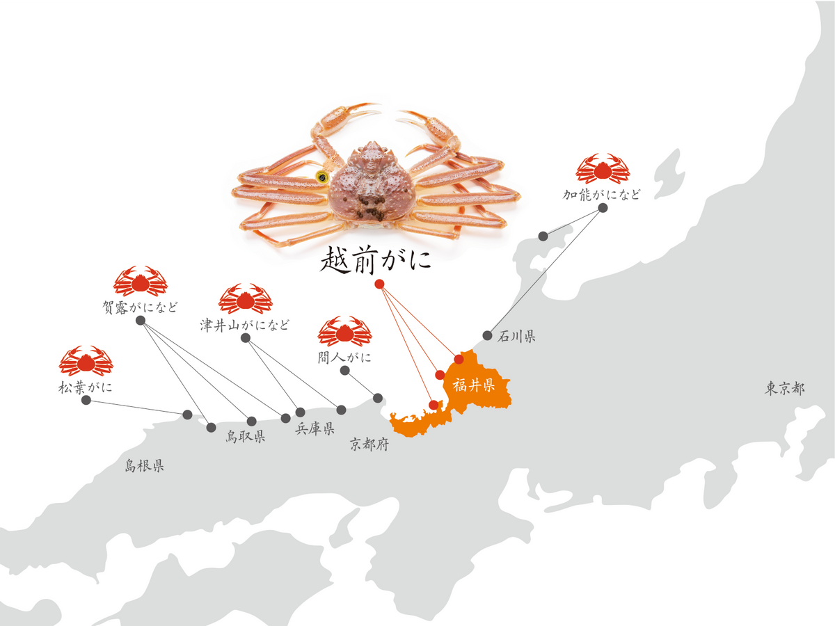 日本海で水揚げされるズワイガニはその地域により同じズワイガニでもいくつかのブランド名と特徴があります。 山形県では芳ガニ(よしがに)、石川県では加納ガニ、福井県は越前ガニ、山陰地方では松葉ガニと呼ばれています。また松葉ガニは水揚げされる地域や港によって間人ガニ、津居山ガニ、柴山ガニなど更に細かく分類されています。