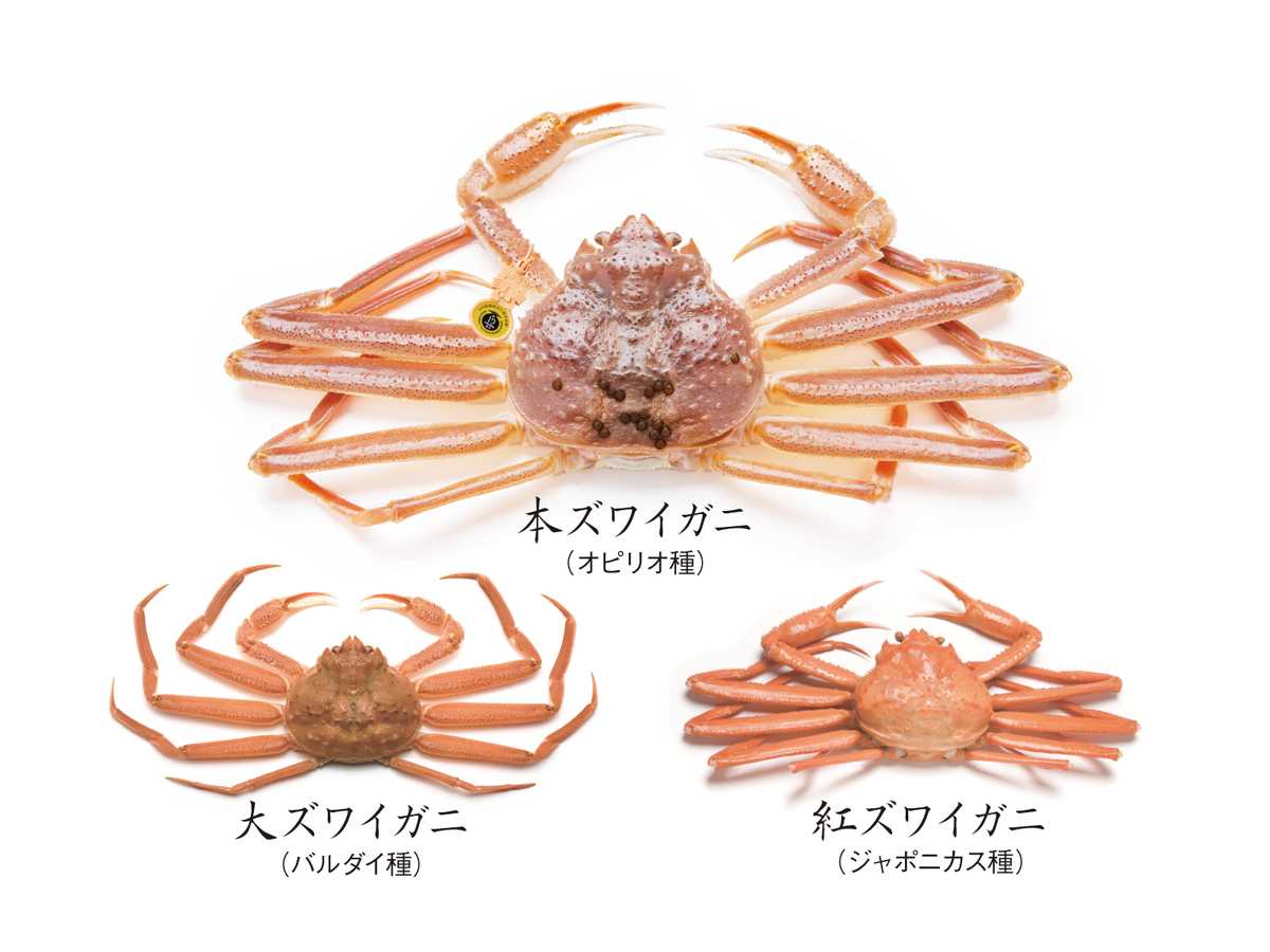 ズワイガニには大ズワイガニ、紅ズワイガニ、本ズワイガニと3つの種類があります。大ズワイガニは別名バルダイ種と呼ばれ日本近海ではほぼ水揚げされることはありません。紅ズワイガニは赤く細長い脚が特徴で価格も安価なため缶詰など加工食品などに使われることも多いです。一般的にズワイガニと呼ばれているのは本ズワイガニを指し、甘く上質な身と濃厚で豊穣なかにみその旨味から冬の味覚の王様とも称されています。