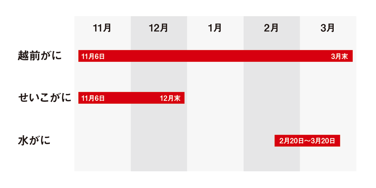 越前がにの漁期は毎年11月6日から翌年3月20日までと定められています。また、雌ガニ(せいこがに)は資源保護のため漁期がさらに短く、11月6日から年内いっぱいまでの約2ヶ月間のみ。その希少性から、旬のせいこがには特別な冬の味覚として愛されています。一方で、「水ガニ」と呼ばれる脱皮後間もないズワイガニは、2月末から3月下旬にかけて漁が行われます。水分量が多く身が柔らかい水ガニは、越前がにとは異なる繊細な風味が特徴で、春先に楽しめるズワイガニとして人気です。それぞれの漁期ごとに異なる旬の味を楽しむことで、越前がにが持つ多様な魅力を堪能することができます。