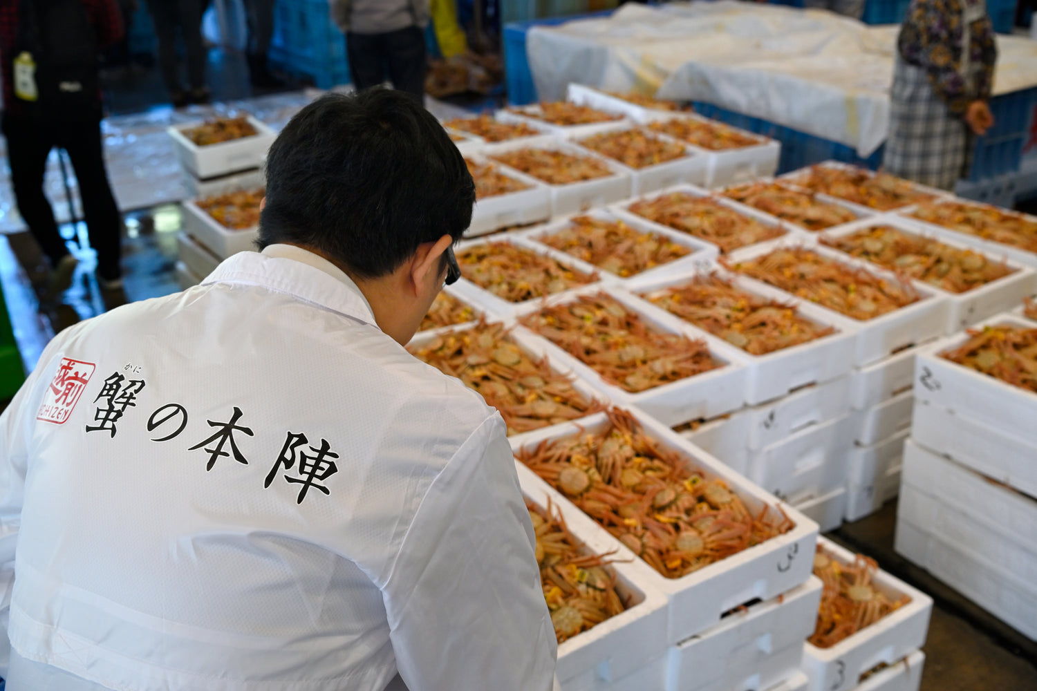 水揚げされた漁場・漁船・蟹の大きさ・重さ・色・艶・硬さ、複雑に絡まりあう様々な要素を一つ一つ紐解き最高級品を選び出す越前「蟹の本陣」の仲買人は40年以上蟹を見つめ続けてきました。年間10,000杯以上の蟹を卸してきた経験に裏打ちされた目利き術がお客様に至高の越前がにをお届けします。