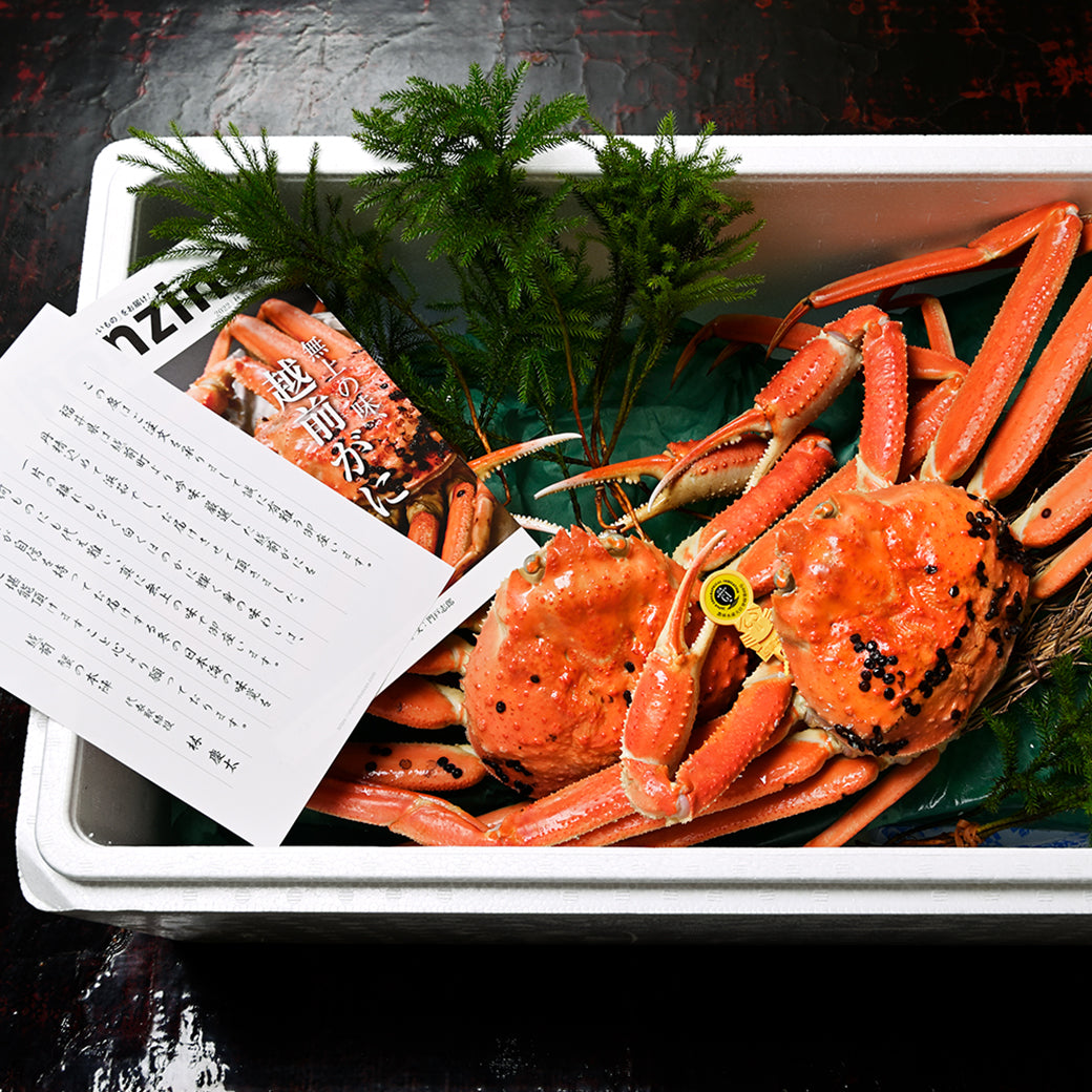 地元福井では女性でも一人一杯は平気でたいらげる、小ぶりなメスガニ『せいこがに』はぎっしりと抱えた2種類の卵が特徴です。甲羅の外にある独特な食感の外子と甲羅の中にある濃厚な内子、どちらも雄蟹にはない癖になる味わい。かに身、ミソ、内子、外子それぞれが持つ独特の旨味が一堂に会した奇跡の味です。キリリとした辛口の日本酒を合わせるのが地元流。