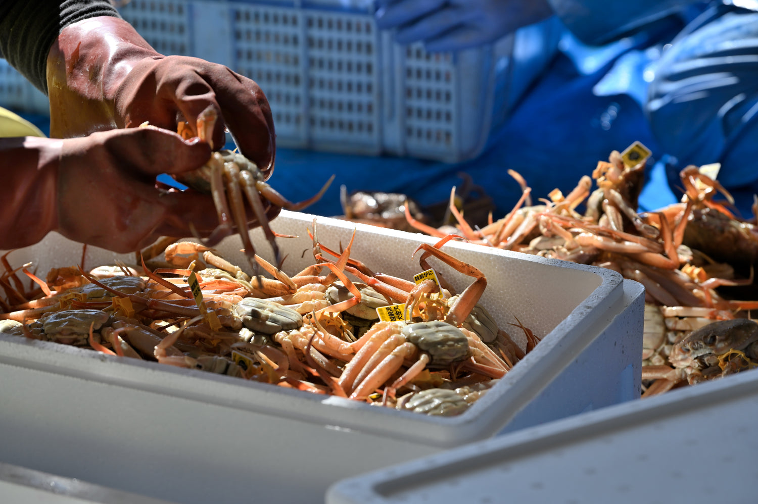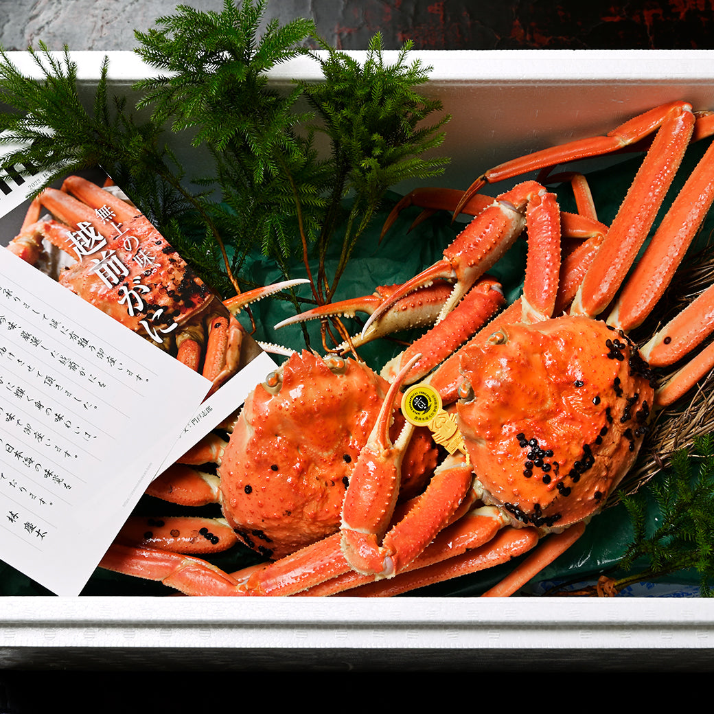 福井県が2015年シーズンより設定した越前がにの最高級ブランド「極」は、甲羅幅14.5cm以上、重さ1.5kg以上(水揚げ時)、爪の幅3cm以上の極大サイズのズワイガニです。さらに競り人や仲買人などに認定されたズワイガニのみが名乗ることを許され、従来の黄色いタグに加え「極」のタグを得ることができます。この厳しい基準に達するのは全水揚量の約0.05%のみが該当するといわれ、1シーズンで約500匹にも満たない厳選された究極の越前がにです。