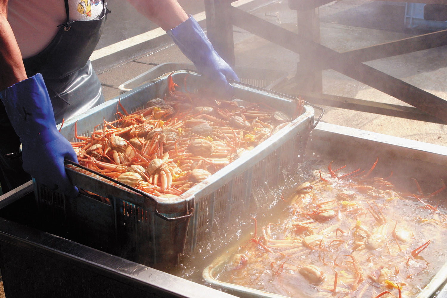 水揚げされた蟹は体内に多くの泥を蓄えているため、このまま茹でてしまうと臭み・雑味を帯びてしまいます。そのため蟹の生息域に限りなく近づけた生簀で数日かけてゆっくりと体内にある泥を吐き出させます。完全に泥が抜けた蟹のみを、ご注文後即座に茹で上げ発送しておりますので、臭み・雑味のない繊細な味をお届けすることができます。